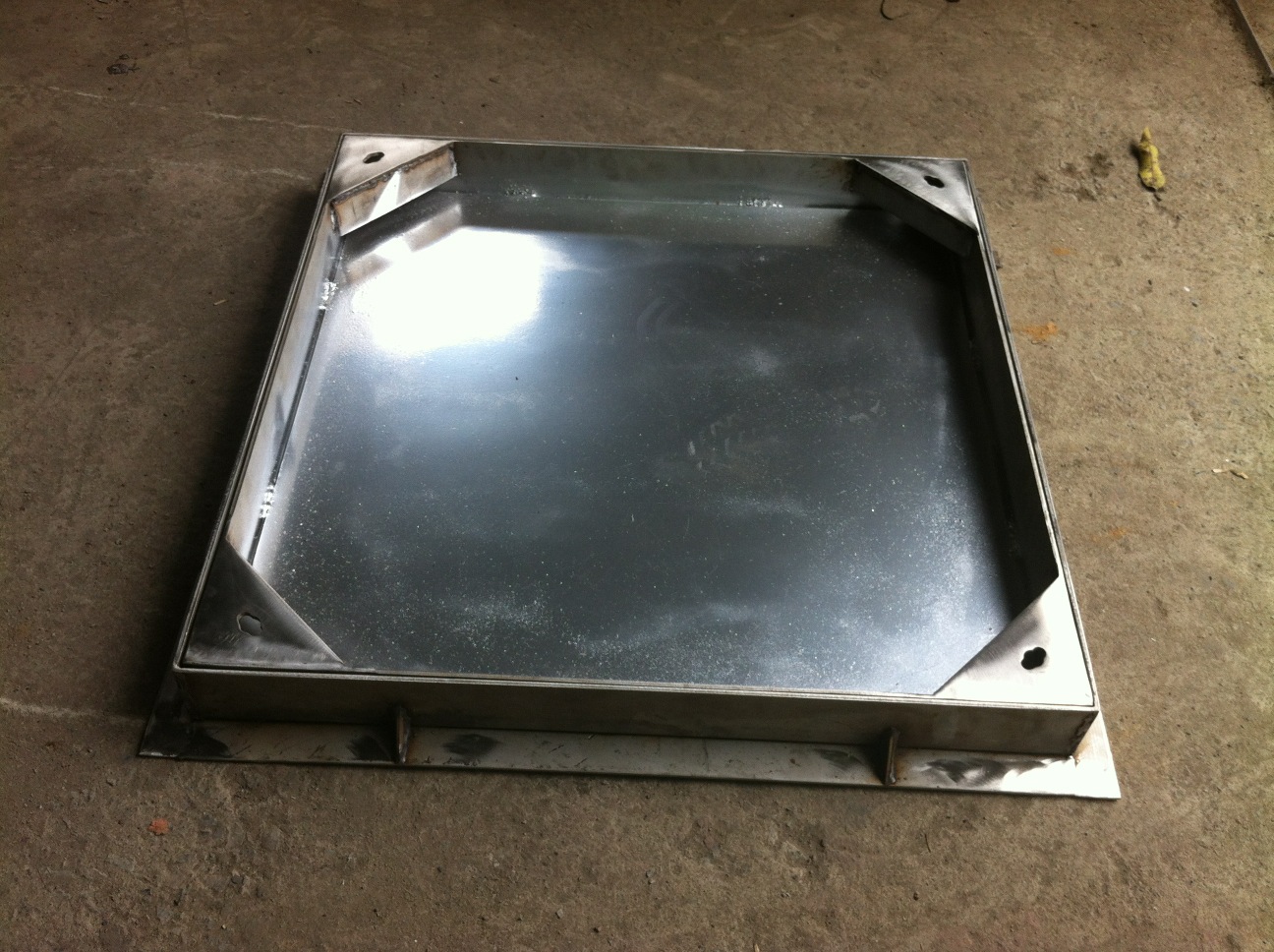 不銹鋼下沉式井蓋采用高強(qiáng)度不銹鋼板材為基材,底部角鋼增強(qiáng),剪裁。折板再加上全套氬氟焊焊接工藝而成的井蓋產(chǎn)品。
