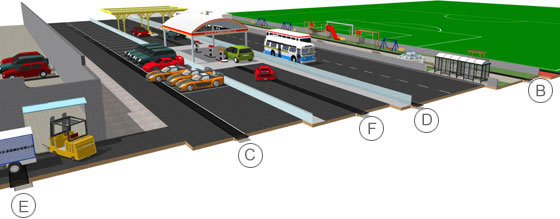 | 荷載力垂直作用于排水溝系統(tǒng)上,沒(méi)有其他運(yùn)動(dòng)產(chǎn)生,通常用于實(shí)驗(yàn)測(cè)試蓋板和溝體的承載力,實(shí)際運(yùn)用中,水溝之上只走人或安放其它產(chǎn)品。 | 行駛中的車(chē)輛產(chǎn)生動(dòng)態(tài)荷載,可對(duì)水溝產(chǎn)生使其移位的扭力。水溝溝體和蓋板承受的荷載、施工方法以及鎖扣系統(tǒng)是在考慮動(dòng)態(tài)荷載時(shí)需要注意的因素。 | |